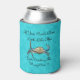 Featured on this stubby can cooler holder on a aqua blue background is a blue swimmer crab with a funny catching crabs logo.