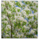 Crab apple tree in full bloom. White flowers and green leaves against the background of clear blue sky