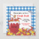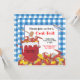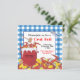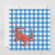 Super fun Crab Boil party invitation. Hot bubbling red pot of crab with corn on the cob, potatoes and lemons, mallet and crab utensil sit on a newspaper with a blue checkered tablecloth patterned background. Hand drawn illustration by McBooboo.