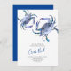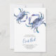 This elegant beach theme party invitation features the words Crab Boil set in a stylish handwritten script typography with event details in a classic charcoal grey serif font on a crisp white background. A replica of my original watercolor crab painting in shades of blue adorns the front. The invite card reverses to a complimentary navy blue color. A coastal chic yet elegant choice for casual seaside New England beach, nautical or summer, 4th of July and engagement parties. To see my entire wedding stationery suite visit DoTellABelle on Zazzle.