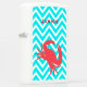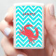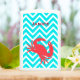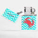 Coastal beach theme white Zippo lighter, with graphics of a turquoise and white chevron zigzag pattern. The coral silhouette of a crab, decorates the bottom of the the lighter and custom coral orange text, on the lid, is ready to personalize.