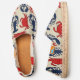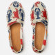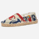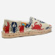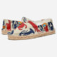 Red crabs and blue lobsters on tan espadrille shoes. Crustaceans from the sea are delicious to eat and fun to wear to summer crab boils or beach parties.