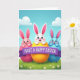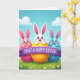 This greeting card shows three cute, human-like long-eared creatures popping out of cracked eggs under a gradient blue sky with soft white clouds, like an early spring morning 🌷. In the center, a snow-white bunny with pink inner ears, big blue eyes, and a rosy blush leans forward from a golden-yellow shell, giving a tender, friendly look. On the left, a pink bunny peeks from a deep pink egg, angled toward the middle as if sharing a little joke 🐰. On the right, a sky-blue bunny rises from an aqua shell, smiling back toward the center to complete the cozy trio. A wide purple ribbon banner stretches across the front, carrying a festive greeting in white lettering placed neatly in the middle of the ribbon. Below the characters, bright green grass spreads across the bottom edge, dotted with tiny white flowers that add a soft, romantic touch to the scene. The lighting stays gentle and sunny, keeping the pastel-and-primary colors bright without feeling harsh. Small white blossoms sit among the grass near the lower edge beneath the purple banner.