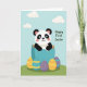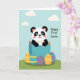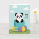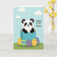 This card shows a cute bear-like animal with black-and-white markings and rosy cheeks peeking out of a cracked blue eggshell, its gentle smile suggesting a sweet, friendly welcome 🐰. Behind it, a calm blue sky stretches across the background with soft, puffy clouds that make the scene feel light and airy. A small, slightly sloped green hill sits at the bottom, giving the character a cozy little place to appear, as if arriving to greet someone special. In the foreground, several decorated eggs rest on the grass, adding a festive touch without crowding the main character 🐇. One egg is bright yellow with orange stripes, another is teal with yellow bands, and two are deep purple with a smooth, simple finish. The phrase “Happy First Easter” appears prominently near the top in green lettering, standing out clearly against the sky. Soft, even lighting keeps the colors gentle and the edges smooth, with the cracked shell pieces shaded in pale and deeper blues. The blue eggshell has jagged, uneven edges around the opening, with small fragments flaring outward above the character’s head.