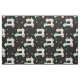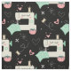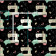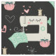 My original vector illustration of happy sewing machines, pins, pin cushions, starbursts, quilt squares, hearts and thread, in tan, pink, aqua, gray and white on black.