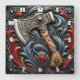 A beautifully crafted fireman's axe is showcased amid intricate swirling patterns of red and blue. Its detailed wooden handle and metallic blade speak of strength and artistry.