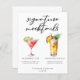 This chic signature mocktails menu paper sheet features simple black tyopgraphy above 2 cute drinks and their ingredients for your wedding bar. A Cranberry Cutie or non-alcoholic Cosmopolitan and a virgin Piña Colada add a cool flair to your bar menu. Complete with the couple's names and date for their reception.