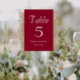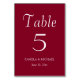 Guide your wedding reception guests to their table with this simple style table number card that features white, stylized lettering on a trendy, cranberry red color background. Design is on each side of card. Edit your card to change table number, wedding couple's names and date. Order cards separately for each table number.