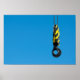 Crane hook with yellow and black stripes hanging, blue sky in background