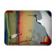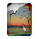 A pair of cranes together beside pond and cherry tree. Colorful vintage artwork from a woodblock print.
