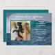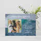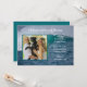Anniversary party invitation with photo of the couple. Crashing ocean waves design with white, Old English style font - change it in the customize area. A bold line of text at the top for years of marriage. All party information is added using a paragraph template. Upload a photo, either horizontal or vertical, with subject in the center. The square photo template is outlined in white. Reverse is solid blue-green color.
