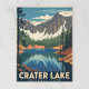A vintage-style travel poster for Crater Lake National Park showcases the deep blue lake reflecting snow-capped mountains and pine forests under a clear blue sky. "CRATER LAKE NATIONAL PARK" is boldly displayed at the bottom.