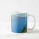 A scenic photo of Crater Lake wraps around this mug. This iconic lake in Oregon's Cascade Mountains is vast beneath the blue sky. The water of the lake is a magnificent blue. Evergreen trees stand tall in the foreground.