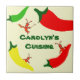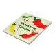 Spice up your kitchen with this Crawfish Hot Pepper Personalized tile. The tile features red, green and yellow chili peppers with a girl crawfish holding a wooden spoon and hot sauce while two boy crawdads help with the peppers. Personalize the tile using the template. All text is customizable. A great gift for that Cajun chef in your life!