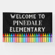 School welcome banner with row of crayons at the bottom! Perfect for welcoming kids and parents to your school. See our classroom welcome banners as well.
