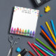 A note from School Teacher notepad personalized with the teacher's name beneath colorful stars and above a row of crayons in a rainbow gradient. Kindergarten teacher notepad with colorful crayons and stars.