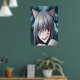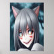 Portrait of a crazy anime cat girl with grey hair and cat ears, with a smile on her face. This is a AI generated art.