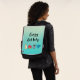 A backpack with the words: "Crazy Cat Lady" written in a trendy font. 4 cute cats below the text. Each cat has a unique personality. One is a cool cat with sunglasses and a tie, another is a sleepy cat, one is a staring cat, and one is a playful cat scrunched up in a box looking ready to pounce. Set on a green colored backdrop.