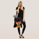 Cute all over print cross body tote bag done in black, with a comical orange and white cartoon cat. Custom text, at the top of the bag reads, Crazy Cat Lady. Fun carry all for any cat lover.