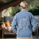 CRAZY CAT LADY cute denim jacket. Simple cat silhouette centered in a circle of the wording CRAZY CAT LADY with three cat paw tracks placed to close the circle. Design is in white.