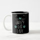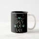 Crazy cat lady in uppercase sans handwritten style font with two turquoise blue paw prints and a blue heart that serves as a cat nose with white whiskers and two white triangle ears.