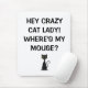 A funny mouse pad for a cat lover It says "Hey crazy cat lady! Where's my mouse?". A fun mousepad to go with your computer. A great gift idea for a cat lover.