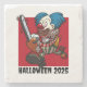 A crazy clown stone coaster memento for your Halloween party guests. Use "Personalize this template" to tweak the "HALLOWEEN 2025" text and make a unique, customized gift. Something to take away from the Halloween party, featuring a colourful, manic clown wielding an orange chainsaw; with wild blue hair and wearing a ruff, massive clown shoes and stripy leggings and sleeves.