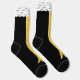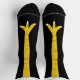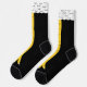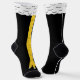 Have fun with these silly chicken leg socks. The base of the design is black with the cartoon interpretation of thin yellow orange chicken legs standing out in contrast with the dark color. The top of the socks is white representing the start of the chicken's feathers. Use them to brighten up your day and bring laughter and silliness to people around you.
