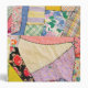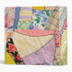 A crazy quilt composed of various patterned fabrics arranged in an eclectic mix with zig-zag stitching.
