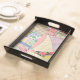 This is a well made, sturdy wooden tray with a flawless black finish and lovely map on the tray surface. It is both vintage & modern at the same time. Looks exactly like the photo; does not disappoint. So nice to find something of quality individually made and not the mass-produced 'shabby chic' merchandise seen in stores. I am so pleased to be able to give this to my college-age niece for her birthday. This can be used as a tray to hold jewelry or toiletries, or hung on the wall as art. The map surface is sealed (it is slightly shiny) so would be moisture resistant. It is well worth the asking price but I was able to apply a sale code as well. Very happy with my purchase. Map is crisp & clear and sealed with a water-resitant finish.