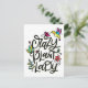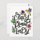 Design features plant illustrations, a humming bird and hand lettered text that reads: "Crazy Plant Lady". This postcard makes a great marketing tool if you're in the business of selling adn caring for plant arrangements. Give these out to your customers with a hand written note, or send them a postcard from "The Crazy Plant Lady" reminding them that you have fresh new blooms for them to see.
