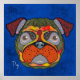 Unique crazy pug dog face with bold, colorful abstract patterns on a blue background. Popular with dog lovers and pet lovers and rescue dog lovers.