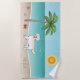 Destei's original cartoon illustration of a cute English cream coat color Golden Retriever breed dog standing in a tropical summer beach scene. On the beige color sand there is a palm tree, a pink seashell together with a starfish and a red crab. The water is turquoise blue with some waves and the sun is shining above the horizon. There is also a personalizable text area for a name. The text is placed on the bottom right corner in a way that makes it look like if it was written on the sand.
