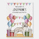 Destei's original cartoon illustration of a cute English cream Golden Retriever breed dog. The dog is placed in a colorful birthday setting with pastel color birthday balloons, gifts and a bunting banner. The pastel colors include pink, green, blue, red, orange and purple. The dog is standing on a yellow wood floor texture and the background has a playful pastel color polka dot pattern. There are also three personalizable text areas.