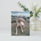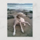 This fun canine postcard features an image of a cream greyhound puppy dog resting on a rock with a the ocean and mountains in the background. The back of the card is blank for your message.