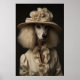 Chic elegant cream colored poodle dog wearing a satin blouse and hat with flowers
