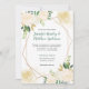 Watercolor wedding invitations with cream and white roses, gold glitter, and gold and green leaves and other greenery with a gold geometric overlay. The background is gold. The template is easy to personalize - your name is an elegant handwritten calligraphy script and the body is a modern font. The back of the card is a watercolor wash in gold.