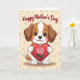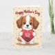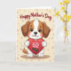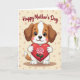 Designed with a sweet cartoon illustration, this card features a small anthropomorphic puppy sitting front and center, gazing out with wide dark eyes and a gentle, affectionate look ❤️. Its fur is white with warm brown patches, and a soft pink blush on its cheeks adds to the tender, friendly mood. The puppy holds a large deep-red heart close to its chest, as if offering it to someone special. Across the heart lies a pink rose with layered petals and a thin green stem, giving the scene a romantic touch without needing anything else said 🌼. Near the top of the design, the message text is placed in a flowing cursive style and colored maroon, standing out clearly against the pale background. The backdrop is a light creamy tone that keeps the focus on the character and the heart. Small pastel polka dots in muted pink and beige are scattered around the background, like soft confetti floating behind the puppy.