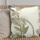 Stylish throw pillow features an artistic botanical floral design in a stylish neutral color palette with soft hues. An artistic floral design features a blooming myrtle branch and an abstract composition with faint geometric circles and olive branches and blooming flowers in earthy shades on a creamy ivory background. This layered composition is built on combinations of flowers, leaves, overlapping with circles and a curious ostrich, all interlaced to form an intricate and complex design. The elegant design elements are layered and and interspersed to give perspective and depth to give depth and perspective to the overall design.