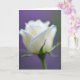 This greeting card features a close-up flower bud in creamy white, just beginning to open, with softly curling petals that lean toward each other like a gentle embrace ❤️. Soft daylight falls across the petal edges, showing fine shadows and a faint, warm yellow glow near the center. A fresh green stem and small leaf-like sepals cradle the bloom, adding a steady, supportive touch that feels quietly affectionate. The background stays out of focus, shifting from deep violet on the left to muted green on the right, so the flower stands forward like a private moment shared between friends. A short message sits near the top in small white lettering, while a second line rests near the bottom in pale yellow text that echoes the flower’s center 🌼. The close framing highlights tiny textures, including a slight fringe along the petals and a soft fuzz on the stem. Behind the bud, the color wash blends smoothly from purple into green with no hard edges.