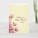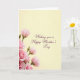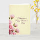 Designed with a gentle floral scene, this card centers on a rising spray of blossoms and buds tucked into the lower-left corner, like a small bouquet being offered with care ❤️. Several open flowers show layered petals in soft pink tones that shift from pale blush to a deeper rosy shade, while nearby buds stay tightly closed as if waiting for the right moment. Slender green stems and leaves in muted olive add contrast and guide the eye upward, creating a calm, affectionate flow. The background is a smooth creamy yellow that feels like early morning light, leaving plenty of open space for the message. In the upper-right area, the text “Wishing you a Happy Mother’s Day” appears in deep plum lettering, set on a slight diagonal and spaced to feel airy. The placement keeps the words and flowers in quiet balance, like a warm exchange between loved ones 🌼. Soft, even lighting gives the petals a velvety look and keeps the yellow backdrop seamless, with the pink blooms clustered low-left and the plum message floating high-right.