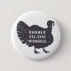 Enjoy being creative this Thanksgiving with this customized text turkey pin back button. It features a turkey silhouette with your own unique words contained inside. Use the customization function to change the font size, font type, and spacing. Enjoy being inventive with slogans and making it your own.