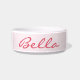 Create your own custom, personalized, girly dark pink classy stylish script / typography custom name at front and back, with three pink stars in the middle and light pink background, ceramic, pet cat kitten dog doggy puppy food bowl. Simply enter your pet's name / your text, to customize. Great for birthday, christmas, holidays, new years, and more, for pet cat / dog owners, friends, and family.