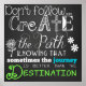 Create the Path Motivational chalkboard look poster with white text design on a black chalkboard look background with a pop of color in blue and green. Text reads "Don't follow...Create the Path knowing that sometimes the journey is better than the Destination"!