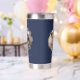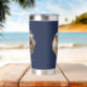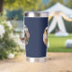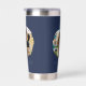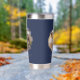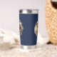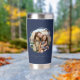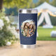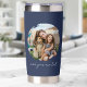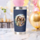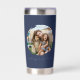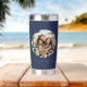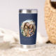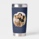 Create your own custom photo insulated tumbler in navy blue color. This tumbler cup features two of your favorite pictures in a circle shaped watercolor brush stroke frame and personalized text for any occasion. A great gift for family and friends or your own photo memory keepsake.