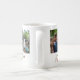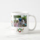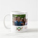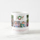 Modern elegant Christmas simple winter holiday family four photo collage coffee mug featuring JOY floral script lettering with red holly berries, fir branches wreath, and a coral red bow. ++++++++++++++++++++ Personalize this with your family pictures, name, and text!