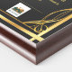 An AI generated business logo template can be replaced with your school, business, college or varsity logo. It is framed by a thin decorative swirl gold border that is edged with a thicker golden frame on a very dark midnight charcoal background. Templates for your personal wording to record an outstanding achievement appear in bold golden fonts and a faux wax seal sits at the top middle with the year on it. Personalize the templates to suit your requirements.