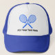 Create Your Own blue Tennis Player Trucker Hat With black text custom.
