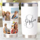 Create a personalized insulated tumbler cup featuring custom monogram initial in modern typography and elegant script calligraphy name alongside four of your favorite photos in a grid collage design. A thoughtful gift idea for family and friends.
