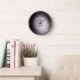 The size of the clock is dramatic and the abstract alcohol ink design is soothing and intricate at the same time. I chose the black frame that adds pop to the blue and gold design. The gold printing would be better in a slightly darker or larger font. I love it and I’m looking for just the right place in ny new apartment. I would recommend this clock for a personal gift or a present. I feel that the quality is excellent for the money! I’m a bit of a clock nut so I’m pretty particular about my purchases. The clock is larger in diameter than many if the clocks I have, so it stands out very well. I think a slightly darker printing color and a moderately larger size would best suit a professional decor or add more impact in a work place item.